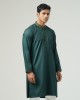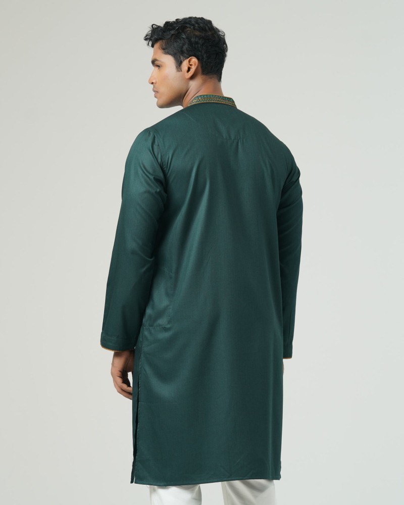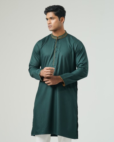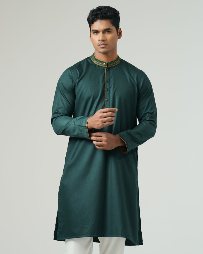 This mens panjabi features intricate karchupi work, enhanced with contrast piping on the collar, placket, and sleeve openings. Made from blended cotton fabric, it ensures comfort and sophistication. Perfect for festive and formal occasions.
