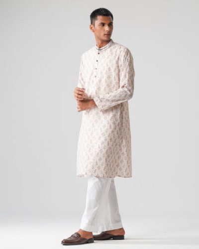 Classic mens basic panjabi in off white, crafted from comfortable mixed cotton fabric. Designed with a subtle flower-based digital print, it features solid detailing and cut & sew work on the collar. A stylish yet traditional choice for any occasion.
