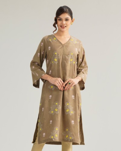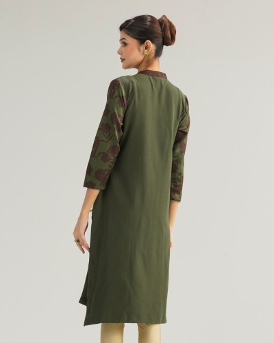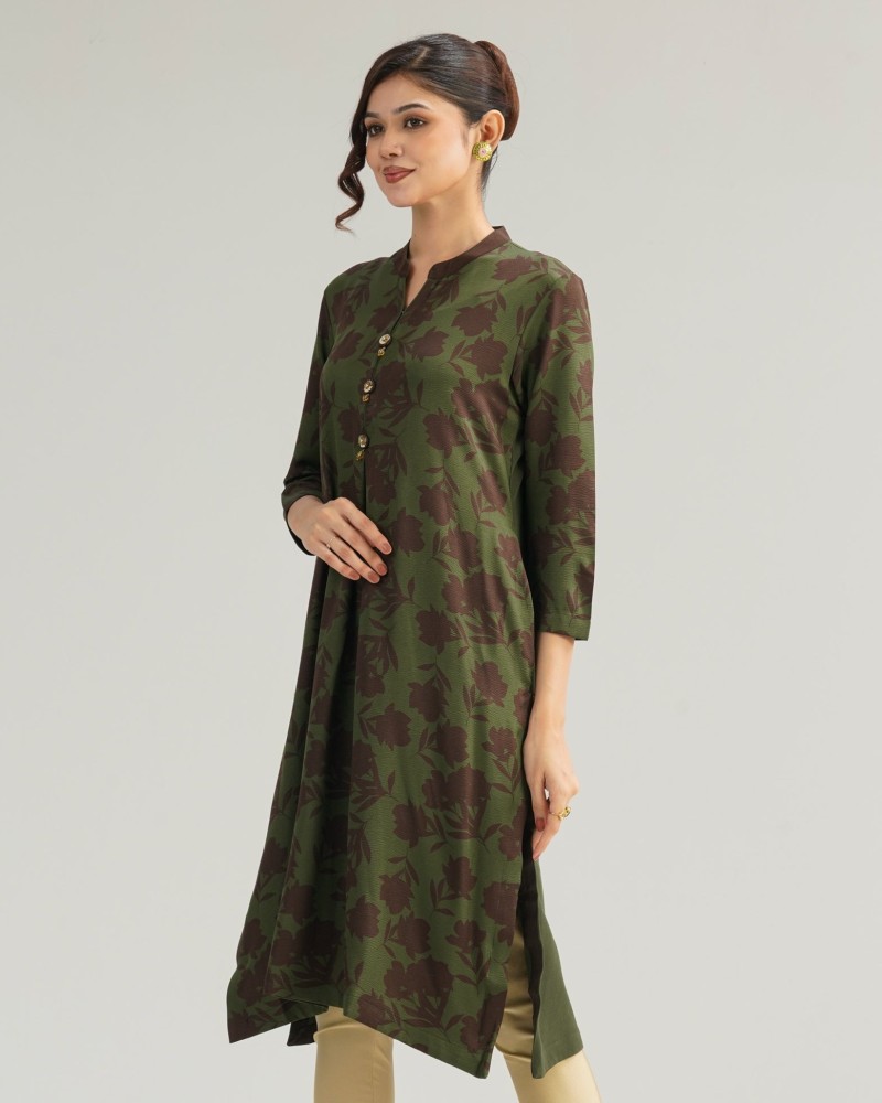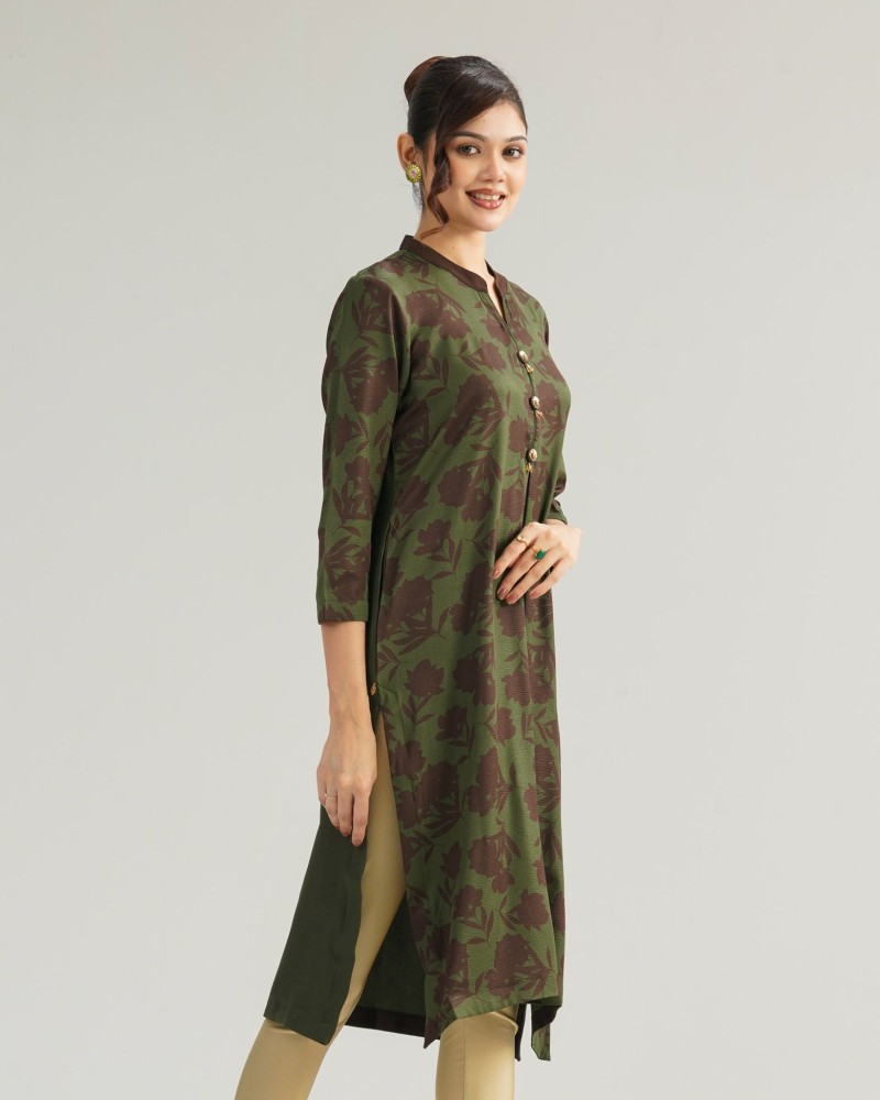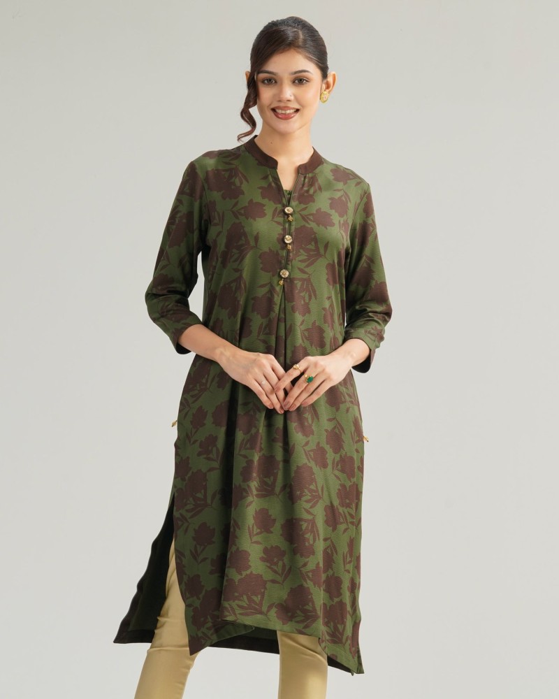 Elegant emerald green womens kurti crafted from soft blended silk for a smooth and comfortable fit. Features vibrant digital prints and decorative buttons for added charm. Ideal for festive occasions, casual outings, or family gatherings.