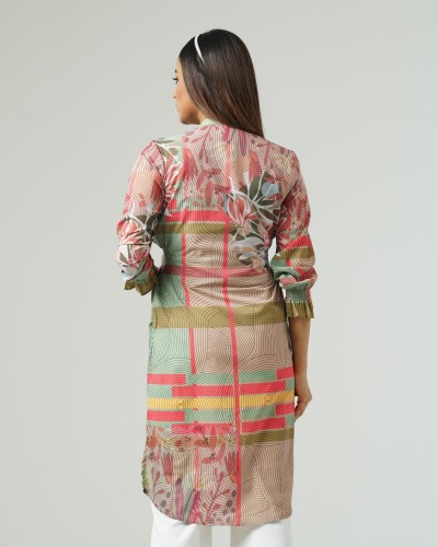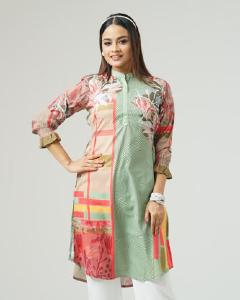 This stylish kurti features a round collar neckline with a vibrant digital placement print, adding a touch of elegance. Made from soft and breathable cotton-blended fabric, it ensures all-day comfort. A perfect choice for casual and semi-formal occasions, offering both style and ease.